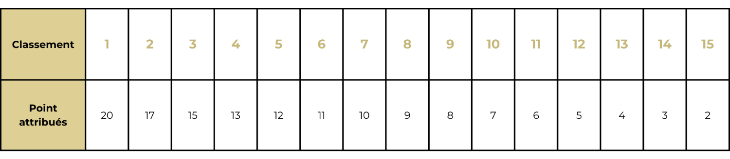 Le calcul des points lors des concours étapes se fait comme suit en fonction du classement de l’épreuve :